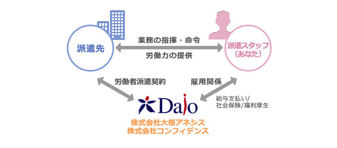派遣とは、あなた(派遣スタッフ)・Daio・派遣先企業の3者で構成されています(下図参照)。